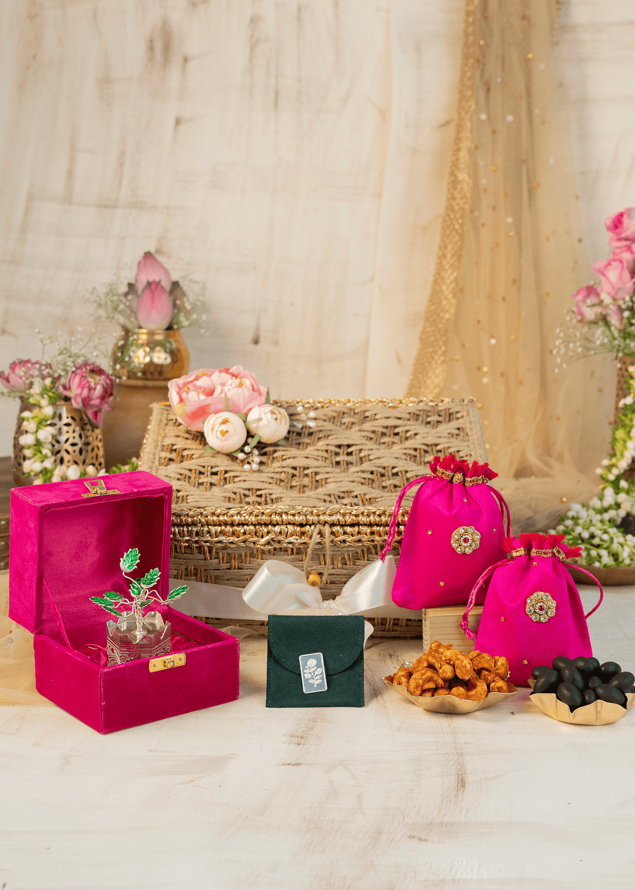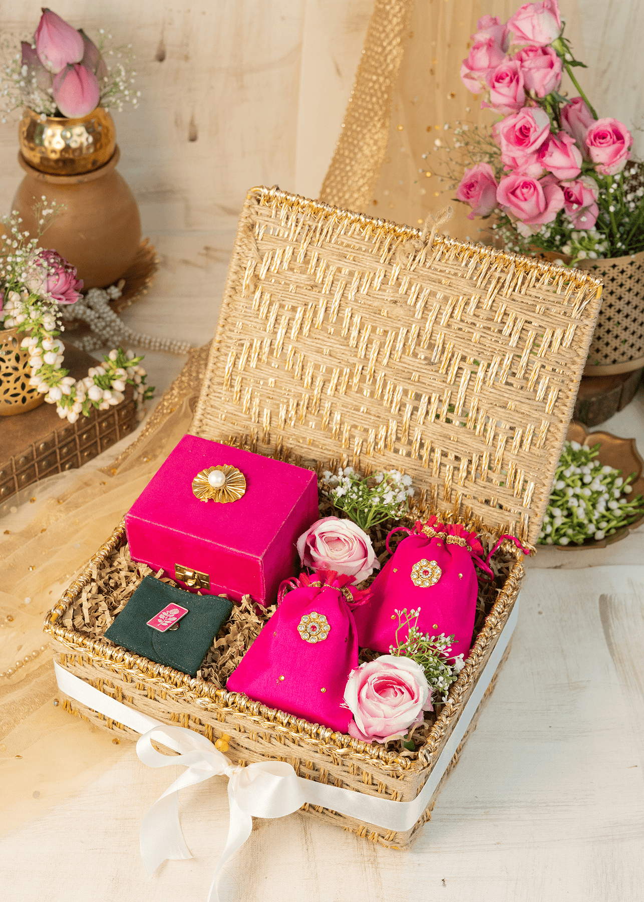 Our attention to detail doesn't stop at the packaging product. Each gift is thoughtfully assembled with color-coordinated satin ribbons and adorned with flower decorations, adding an extra touch of elegance and joy.